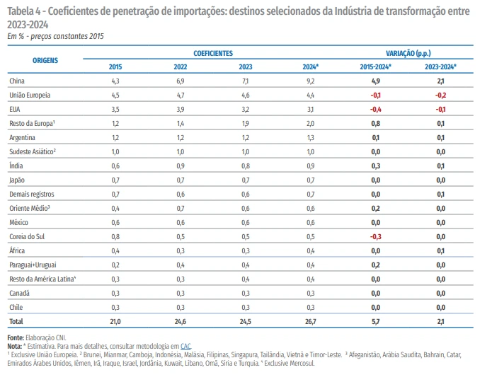 O estudo aponta a China como principal vetor do avanço: a participação de bens chineses no consumo do Brasil saltou de 7,1% para 9,2% em 2024, o maior nível da série histórica.