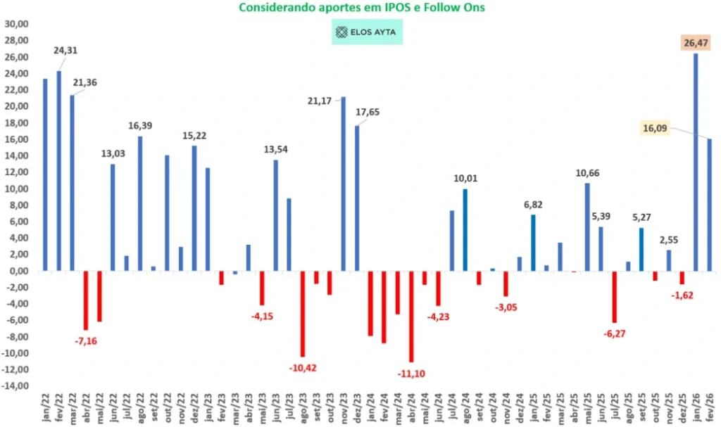 A intensidade do movimento fica clara ao notar que o acumulado de janeiro e fevereiro já representa 158% do fluxo total registrado em todo o ano de 2025. Enquanto janeiro isolado trouxe o maior aporte mensal desde o início de 2022, fevereiro manteve o vigor com R$ 16,09 bilhões em entradas, mesmo com o calendário reduzido pelo Carnaval.