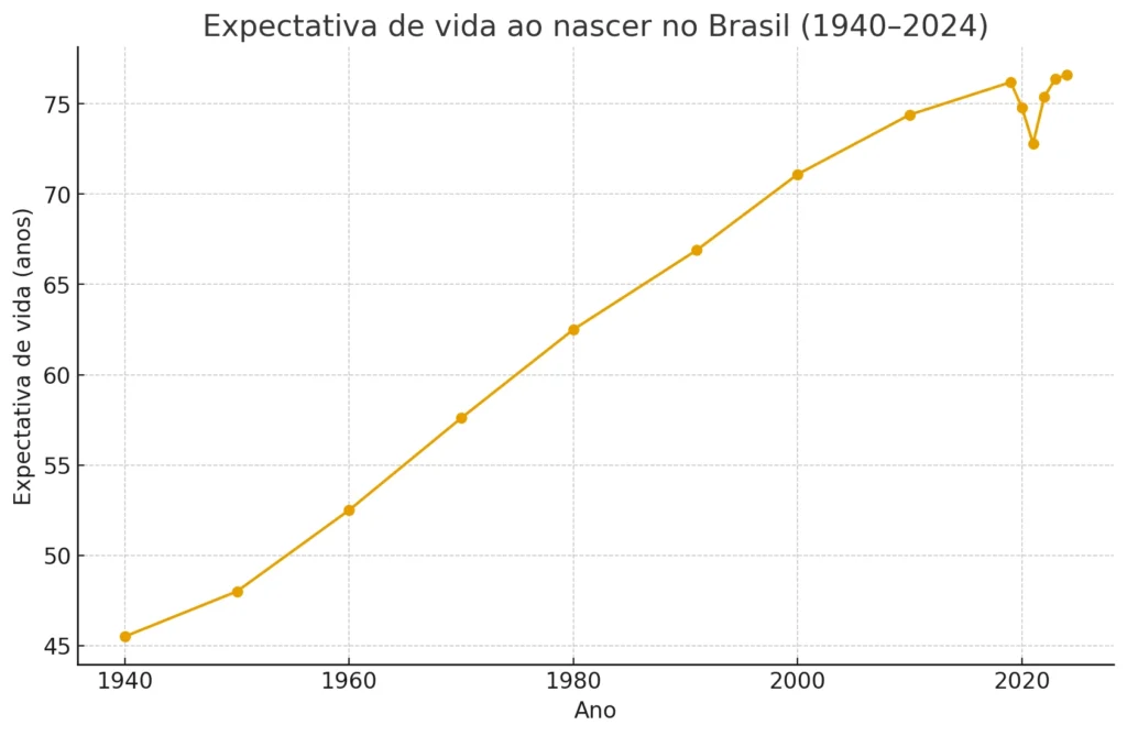 Expectativa de vida ao nascer no Brasil (1940–2024). Fonte: IBGE