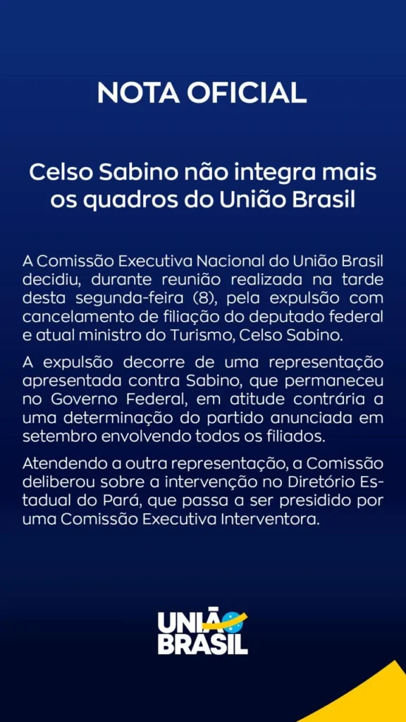 O União Brasil comunicou nesta segunda-feira (8) a expulsão e o cancelamento de filiação do deputado federal e atual ministro do Turismo, Celso Sabino. A decisão foi tomada pela Comissão Executiva Nacional do partido durante reunião realizada na tarde.