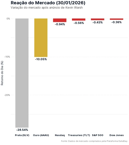 A reação dos ativos foi ilustrativa dessa complexidade. Segundo dados compilados pela Plataforma DataBay, o mercado de bonds teve uma reação relativamente contida, com a curva de juros apresentando um leve steepening. Já os mercados de commodities reagiram de maneira expressiva, com selloffs agressivos em Ouro e Prata. Na minha visão, esses movimentos extremos nas commodities derivam mais de uma reversão técnica e rebalanceamento de portfólio após a performance surpreendente do ano, do que de uma leitura clara sobre a trajetória futura dos juros.