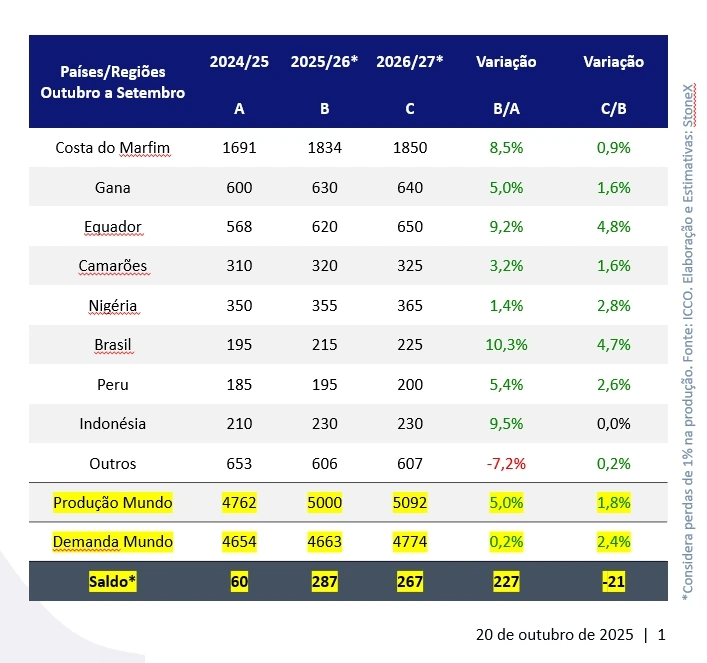 Para a safra 2025/26, a StoneX revisou a produção global de cacau, com aumento da oferta na Costa do Marfim, leve ajuste negativo em Gana e redução da demanda mundial. Mesmo com revisões para baixo tanto da produção quanto do consumo, o saldo global permaneceu positivo em 287 mil toneladas.