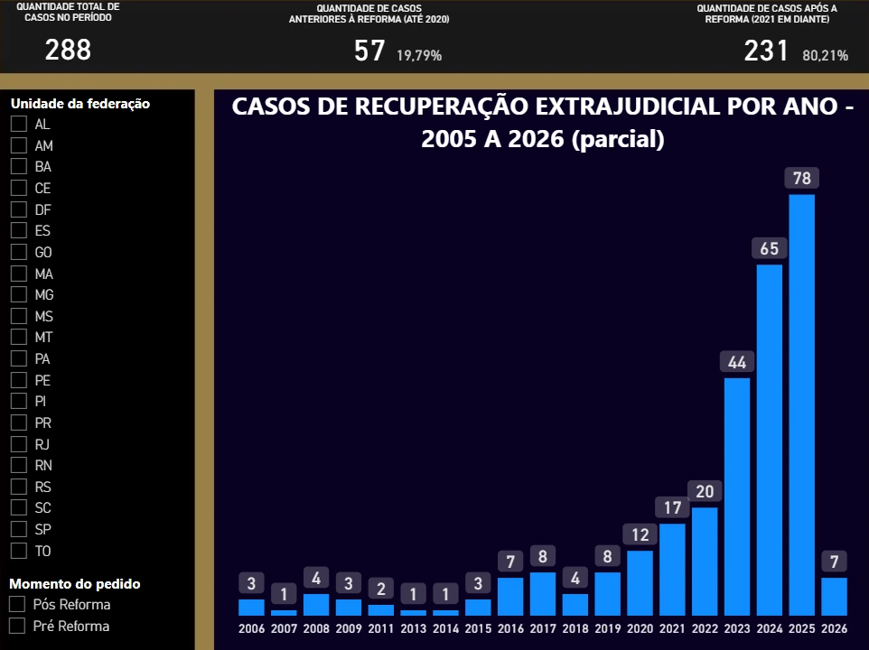 O crescimento do uso da recuperação extrajudicial também aparece na evolução histórica dos pedidos. Dados do OBRE mostram que o mecanismo ganhou força nos últimos anos, especialmente após mudanças na legislação que ampliaram a utilização do mecanismo como alternativa à recuperação judicial.