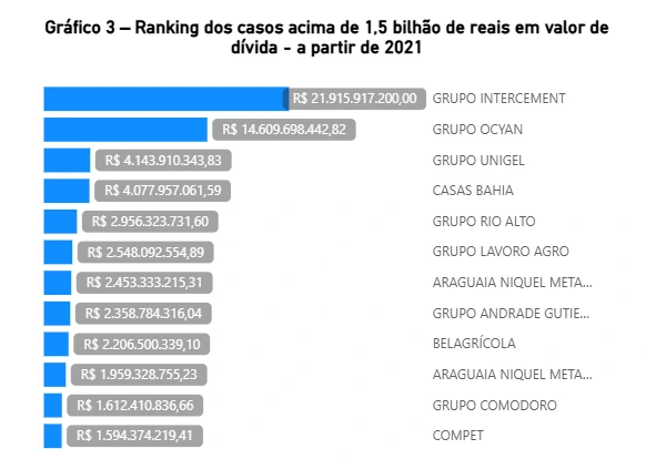 O Grupo Ocyan (antiga Odebrecht Óleo e Gás) figura na terceira posição da lista, com um passivo de R$ 14,6 bilhões. A companhia pediu recuperação extrajudicial em 2023, mas acabou avançando para um processo de recuperação judicial no ano seguinte.