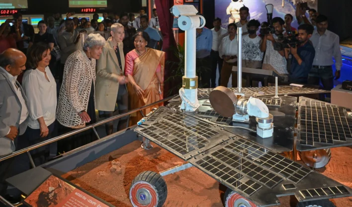 Réplica do rover Opportunity da NASA durante a cerimônia de apresentação no Museu Industrial e Tecnológico Visvesvaraya em Bengaluru, Índia.