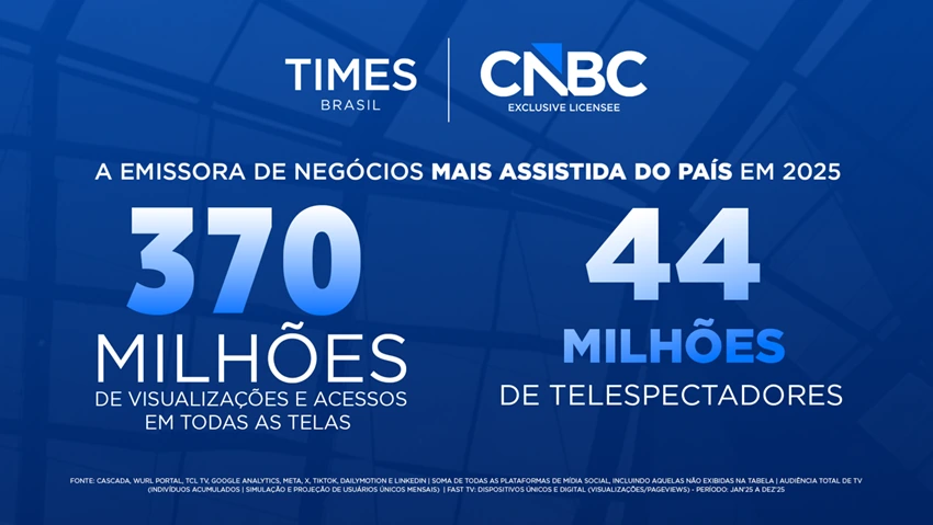 Ao longo de 2025, o Times I CNBC impactou o público 370 milhões de vezes e conquistou quase 44 milhões de telespectadores, com crescimento ininterrupto mês a mês e evolução em todas as telas. Os números são a soma dos dados aferidos no Google Analytics, Meta, Youtube, TikTok, FastTVs, Dailymotion e TV.