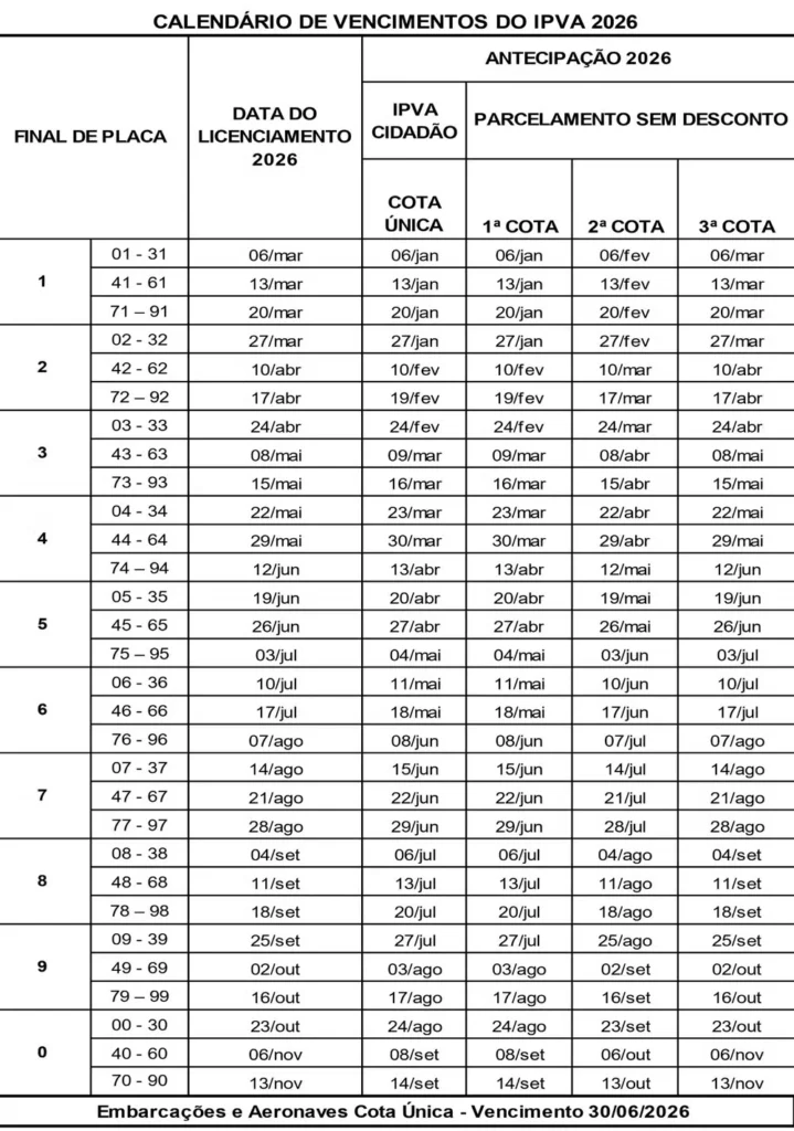 Os proprietários de veículos automotores podem iniciar o cronograma de pagamento do IPVA 2026 com base no calendário oficial divulgado pelo governo local. As datas são baseadas com o final da placa de cada veículo, para facilitar e evitar atraso no pagamento por parte dos contribuintes.