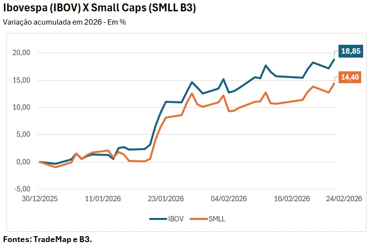 Essa leitura é reforçada por um levantamento do TradeMap feito a pedido do Times Brasil — Licenciado Exclusivo CNBC. No acumulado de 2026 até 24 de fevereiro, o Ibovespa B3 subiu 18,85%, enquanto o índice de Small Caps (SMLL) avançou 14,4%. A diferença de 4,45 pontos percentuais sugere que, até aqui, a alta tem sido mais capturada pelas ações de maior peso e liquidez.