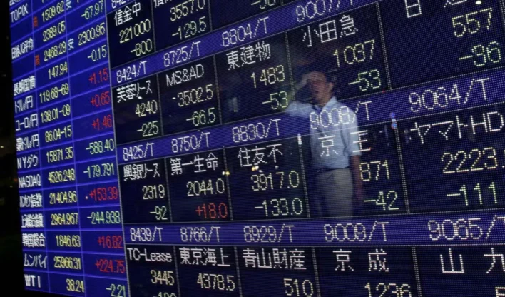 Homem observa tabela com cotações da bolsa de valores em Tóquio, no Japão