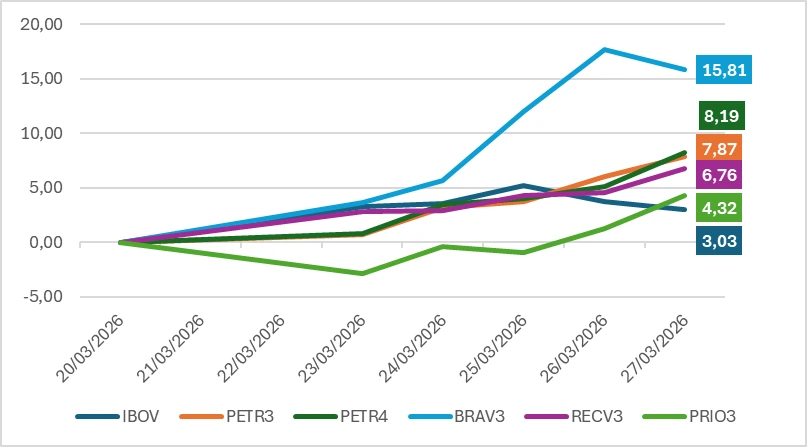 Impulsionadas pela alta do petróleo brent, que encerrou a semana no patamar de US$ 105,32 o barril, as ações de petroleiras também brilharam na bolsa, figurando entre os dez melhores desempenhos da semana.