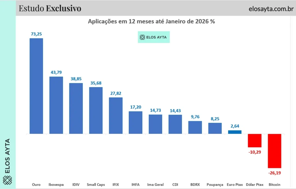 No horizonte de 12 meses, o protagonismo muda de mãos. O ouro acumula valorização de 73,25% até janeiro de 2026, refletindo um ciclo global de busca por proteção em meio a juros reais elevados, tensões geopolíticas e um dólar mais fraco no cenário internacional.