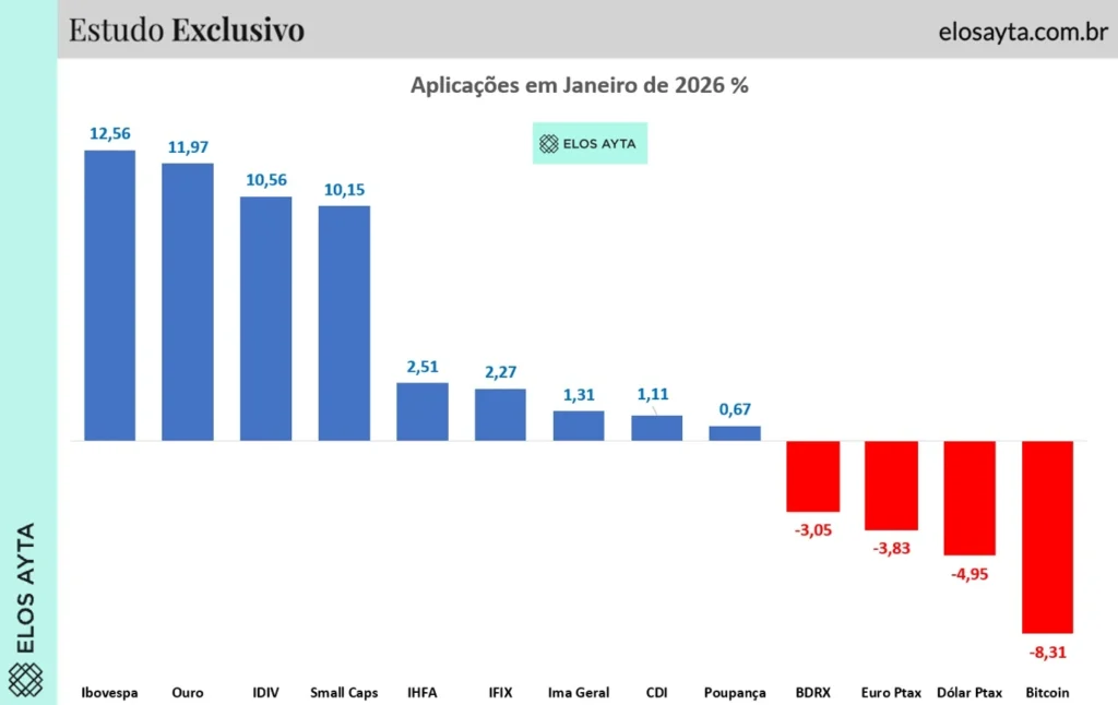 O ano de 2026 começou com um movimento pouco comum no mercado financeiro brasileiro. Em janeiro, o Ibovespa B3 subiu 12,56%, desempenho que colocou a bolsa brasileira como o melhor investimento entre 13 classes de ativos analisadas no mês, segundo levantamento da Elos Ayta Consultoria.