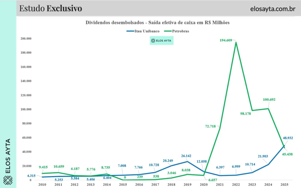 Segundo levantamento da Elos Ayta Consultoria, o Itaú distribuiu cerca de R$ 48,9 bilhões aos acionistas ao longo de 2025. No mesmo período, a Petrobras pagou aproximadamente R$ 45,4 bilhões, ficando na segunda colocação.