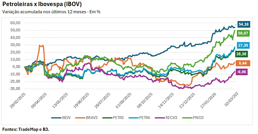 Já entre as empresas menores do setor, o desempenho foi mais heterogêneo. A Brava acumula alta de 6,441%, enquanto a PetroReconcavo registra queda de 6,065% em 12 meses.