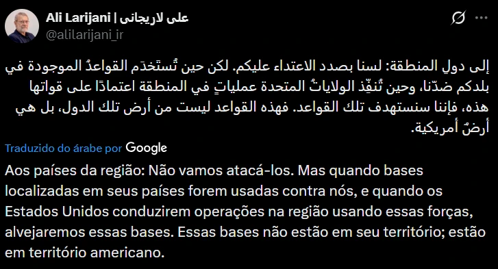 Em seguida, Larijani publicou uma segunda publicação, afirmando que o país não tem intenção de atacar nações da região, mas advertiu que bases localizadas nesses territórios poderão ser alvo se forem usadas em operações contra o Irã.