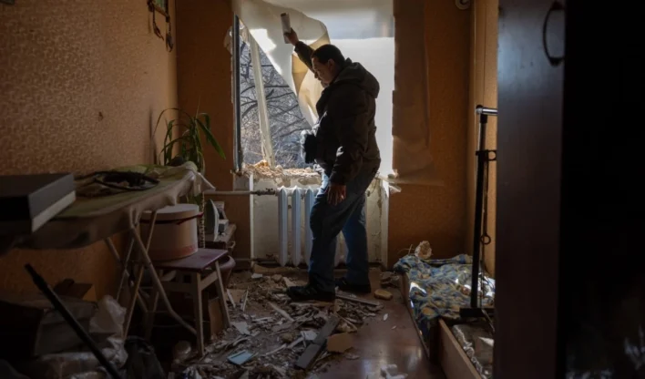 Um homem está dentro de um apartamento danificado após um ataque aéreo russo em Odessa, em 28 de março de 2026, durante a invasão russa da Ucrânia.