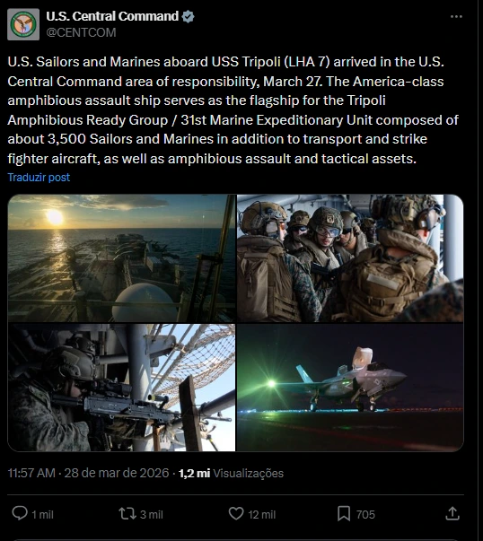 “Marinheiros e fuzileiros navais a bordo do USS Tripoli (LHA 7) chegaram à área de responsabilidade do Comando Central dos EUA em 27 de março”, informou comunicado publicado na plataforma X.