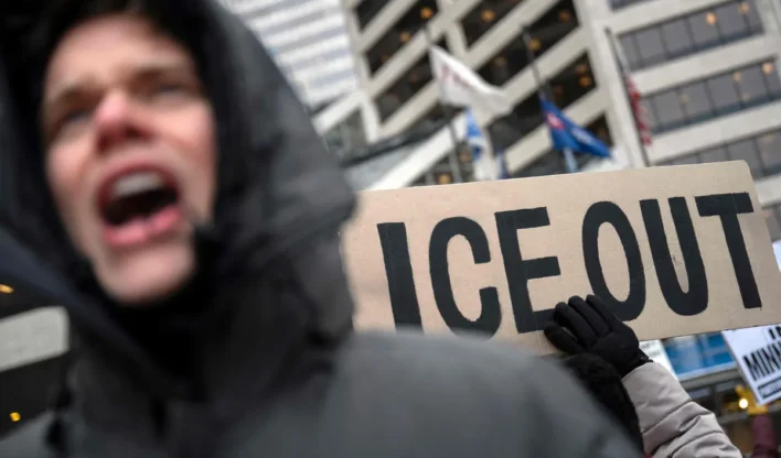 Em Minneapolis, onde as temperaturas chegaram a -23°C na sexta-feira, manifestantes agasalhados com chapéus, luvas e cachecóis gritavam “Fora ICE” depois que o grupo anti-Trump Indivisible Twin Cities convocou um dia de “Sem trabalho. Sem escola. Sem compras” como parte de uma ação de protesto mais ampla contra o ICE.