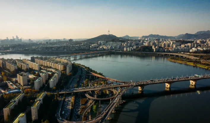 Vista aérea do horizonte do centro de Seul, com veículos em uma via expressa e uma ponte sobre o rio Han, na cidade de Seul, Coreia do Sul.
