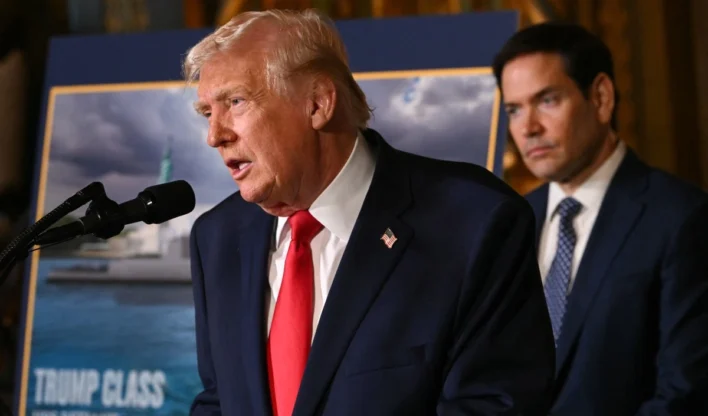 O secretário de Estado dos EUA, Marco Rubio, observa enquanto o presidente dos EUA, Donald Trump, discursa após anunciar a nova iniciativa Frota Dourada da Marinha dos EUA, revelando uma nova classe de navios de guerra, em Mar-a-Lago, Palm Beach, Flórida, em 22 de dezembro de 2025