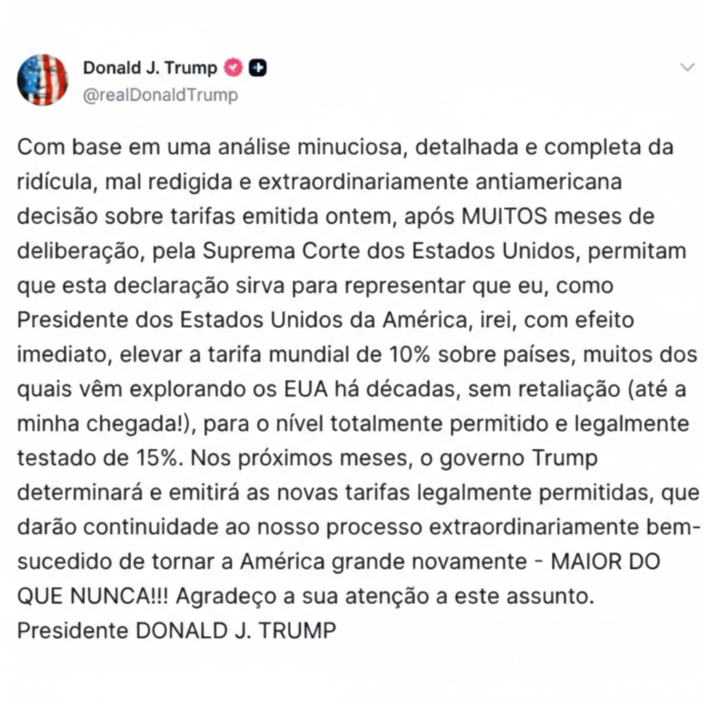 Em publicação na rede Truth Social, o presidente afirmou que a nova tarifa de 15% entra em vigor “imediatamente”. Segundo ele, diversos países teriam explorado comercialmente os Estados Unidos por décadas. “Eu, como presidente dos Estados Unidos da América, estarei, com efeito imediato, elevando a tarifa global de 10% para o nível totalmente permitido e legalmente testado de 15%”, escreveu.